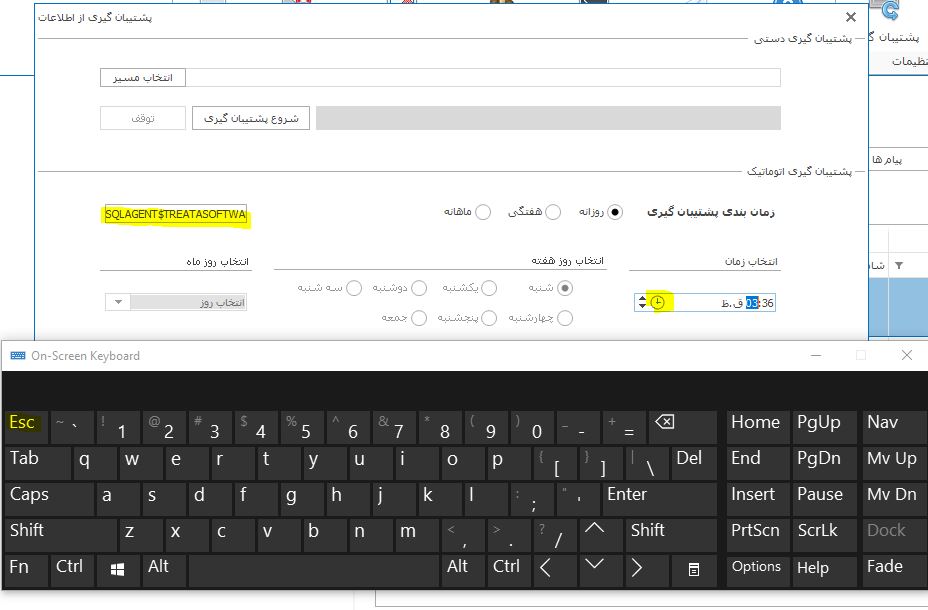 - برای رفع مشکل پیش آمده باید بعد از ورود به نرم افزار در قسمت پشتیبان گیری بصورت خودکار روی علامت ساعت کلیک کرده و 2 مرتبه دکمه ( ESC ) کلیک بفرمایید.